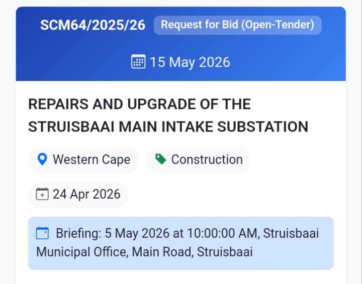 The Cape Agulhas Municipality is inviting qualified contractors to bid for the Repairs and Upgrade of the Struisbaai Main Intake Substation. This project is ideal for companies in construction and electrical infrastructure.